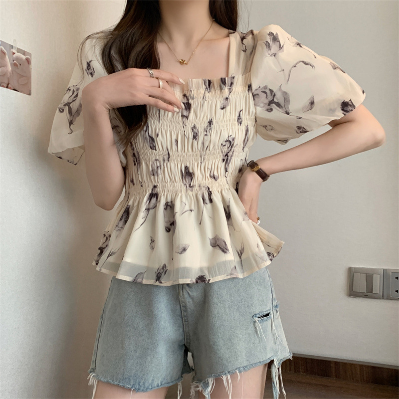 ملابس نسائية مقاس كبير من Real Shot 2024 قميص شيفون زهري جميل للسيدات صيفي بياقة مربعة وأكمام فقاعية تصميم قميص