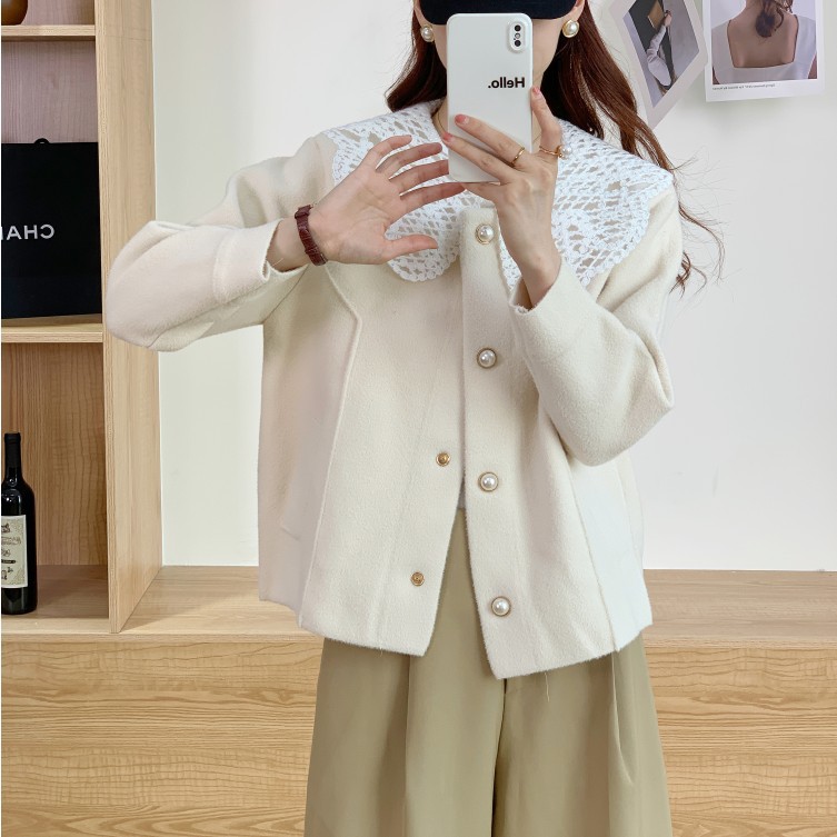 2023 الخريف والشتاء جديد الدانتيل الفرنسي دمية طوق معطف الصوف المرأة قصيرة فضفاضة سترة محبوكة صغيرة المرأة
