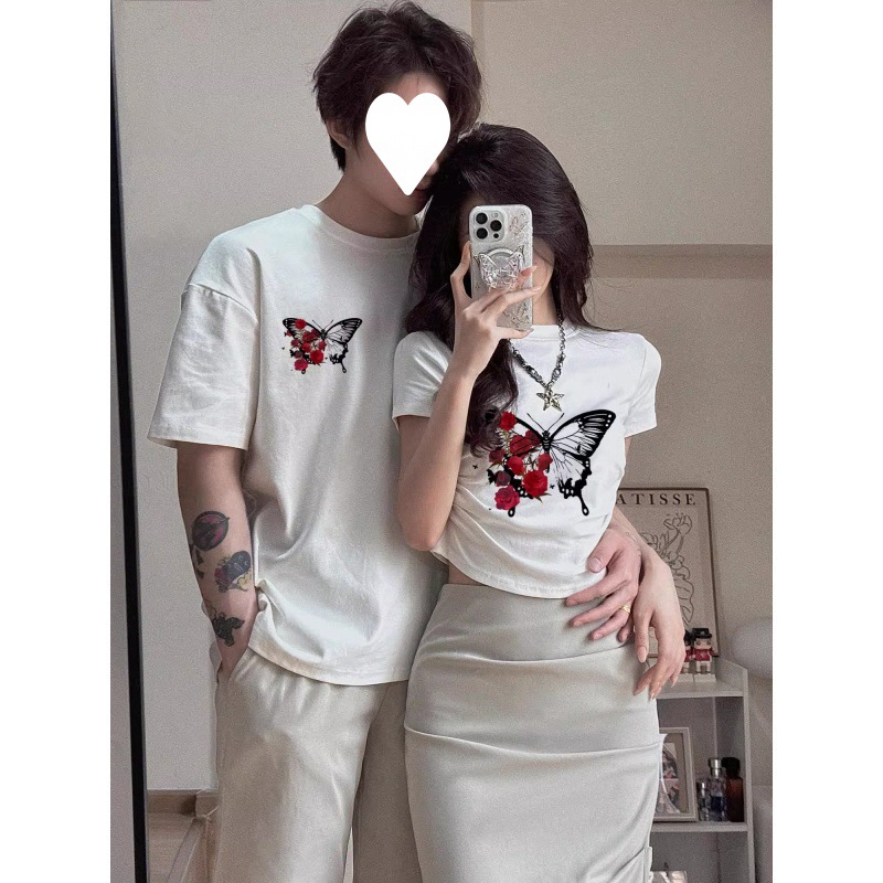 [250 جرام غزل مزدوج -220 جرام ممشط] تي شيرت من القطن الخالص بأكمام قصيرة على شكل فراشة عالية الإحساس