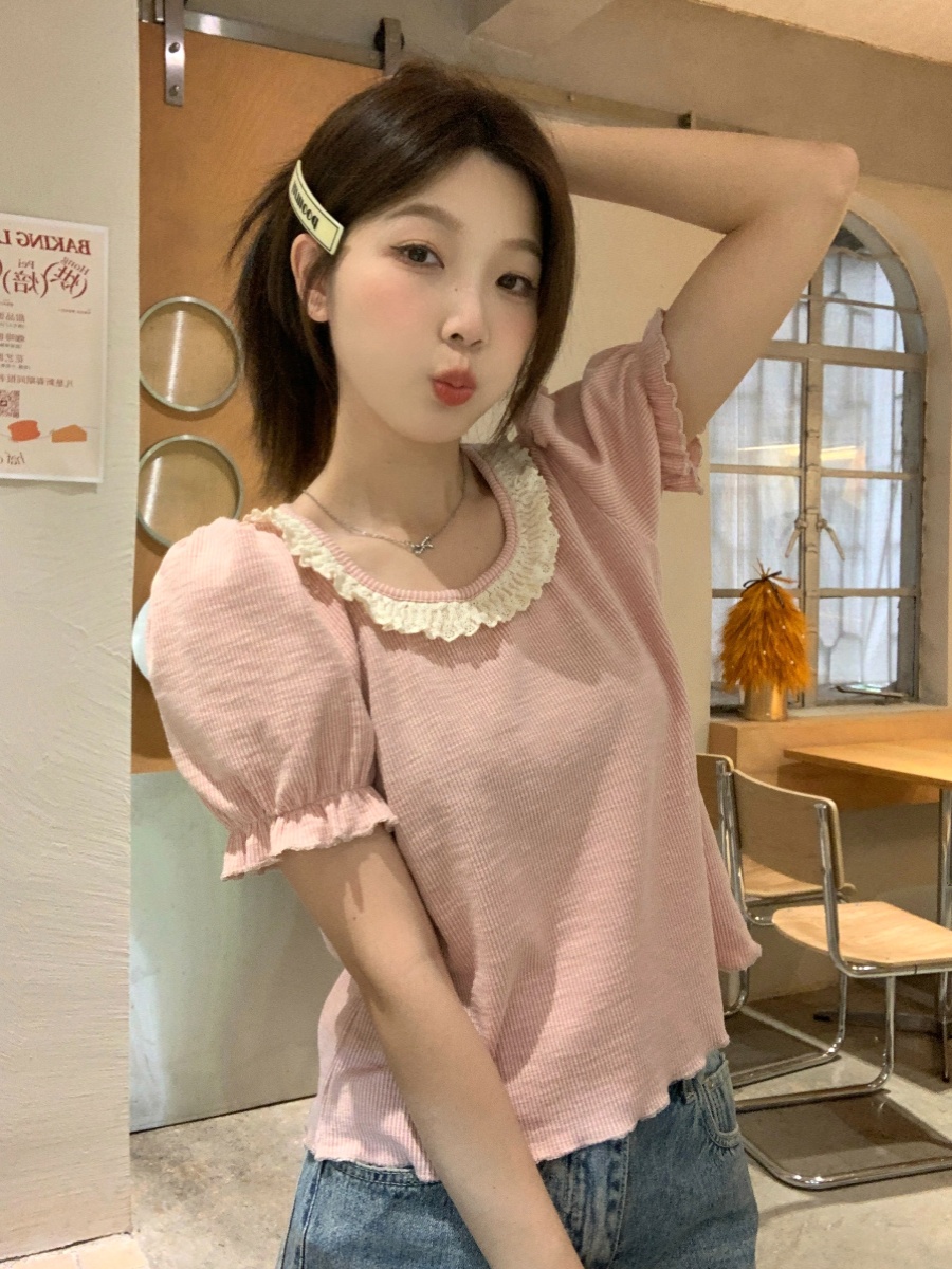 قميص نسائي صيفي بأكمام قصيرة وكتف يمين من الدانتيل