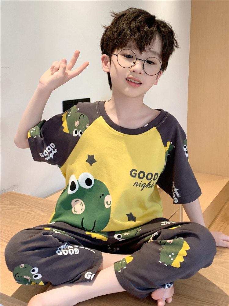 بيجامات للأولاد للربيع والخريف من القطن الخالص الرقيق 2024 سراويل صيفية جديدة للأطفال من القطن بأكمام قصيرة للأولاد ديناصور كارتوني