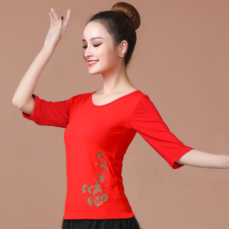 ساحة الرقص الأعلى ملابس الرقص النسائية قصيرة الأكمام ملابس الرقص مشروط الملابس المطرزة الياقة المدورة تي شيرت