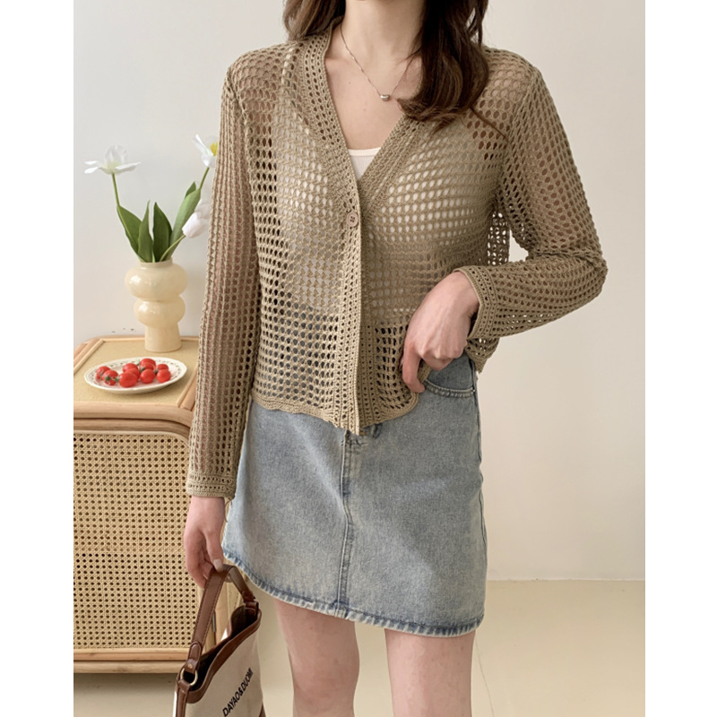 سترة واقية من الشمس بأكمام طويلة مجوفة للنساء لصيف 2024 قميص محبوك فضفاض على الطراز الكوري قميص قصير شال علوي