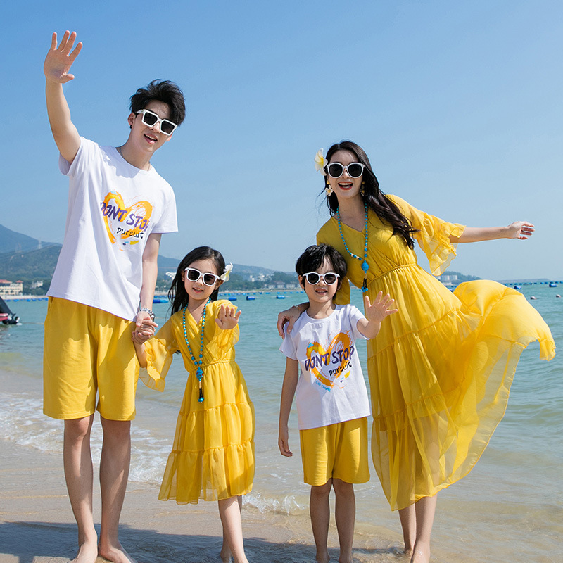 فستان الشاطئ على شاطئ البحر للوالدين والطفل فستان الأم والابنة عائلة مكونة من ثلاثة وأربعة أفراد صيفي مقاس كبير بدلة سانيا للعطلات بأكمام قصيرة