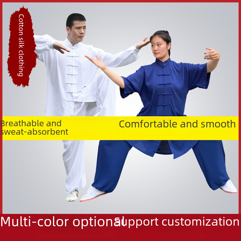 ملابس تمارين تاي تشي بأكمام طويلة من القطن والحرير ملابس صيفية للرجال والنساء مكونة من 5 ألوان للياقة البدنية تناسب ملابس أداء تمارين الصباح تاي تشي