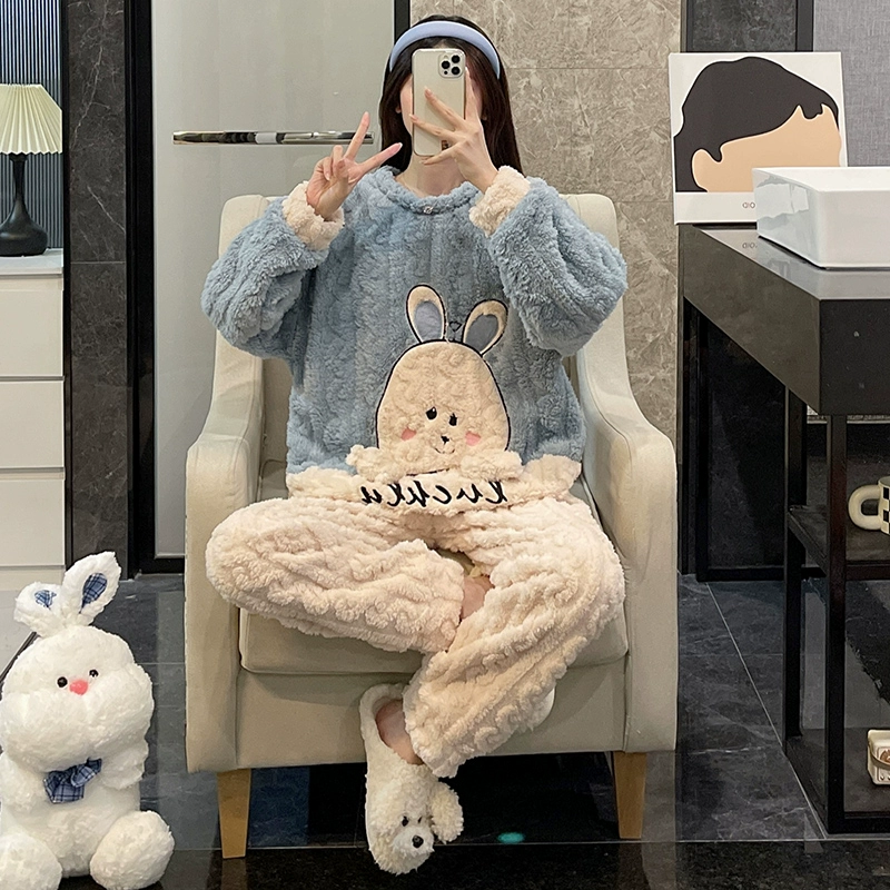 بيجامة نصف مخملية للنساء على الطراز الكوري كرتونية سميكة