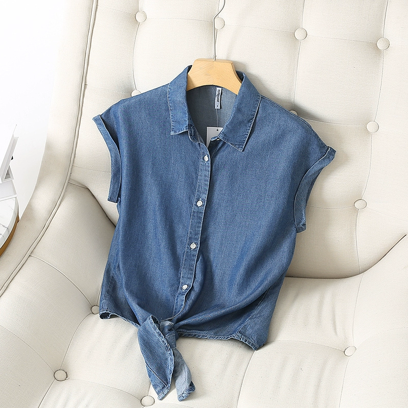 قميص دينم Tencel بحاشية معقودة، النسخة الكورية الصيفية القصيرة للسيدات، فضفاض ونحيف، شال رفيع بدون أكمام