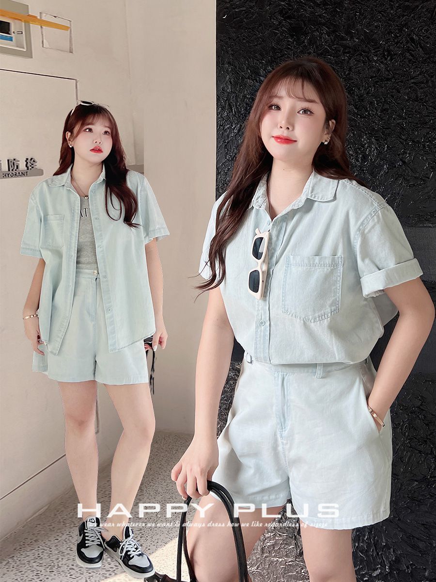 قميص دينم رفيع مغسول بطية صدر صغيرة وسراويل قصيرة واسعة الساق تناسب ترطيبها 8681 مقاس كبير غطاء دينم رقيق غير رسمي للنساء