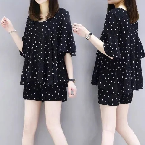 حجم كبير بدلة نسائية أنيقة السمين mm2024 صيف جديد الكورية نمط البطن تغطي المألوف قصيرة الأكمام السراويل قطعتين مجموعة