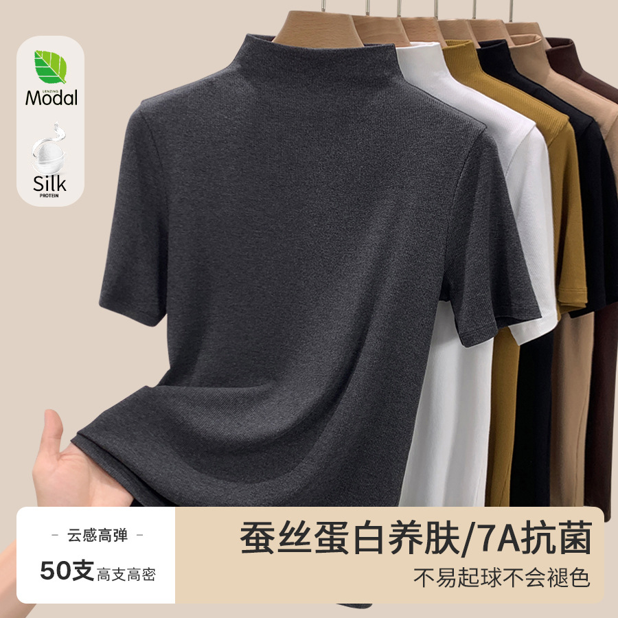 قميص نسائي نصف الياقة المدورة قاع ربيع جديد 2024 مشروط كم قصير تي شيرت داخلي بروتين الحرير 1688