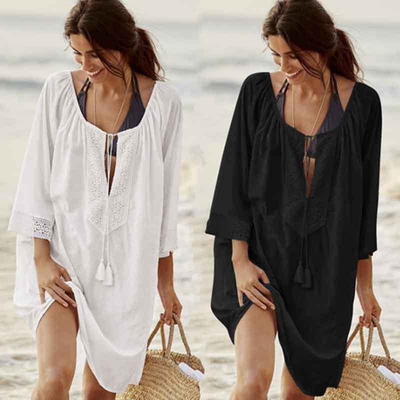 فستان صيفي نسائي صيفي أوروبي وأمريكي عبر الحدود برقبة على شكل حرف V بلون سادة بالإضافة إلى حجم فستان بلوزة الشاطئ الواقي من الشمس