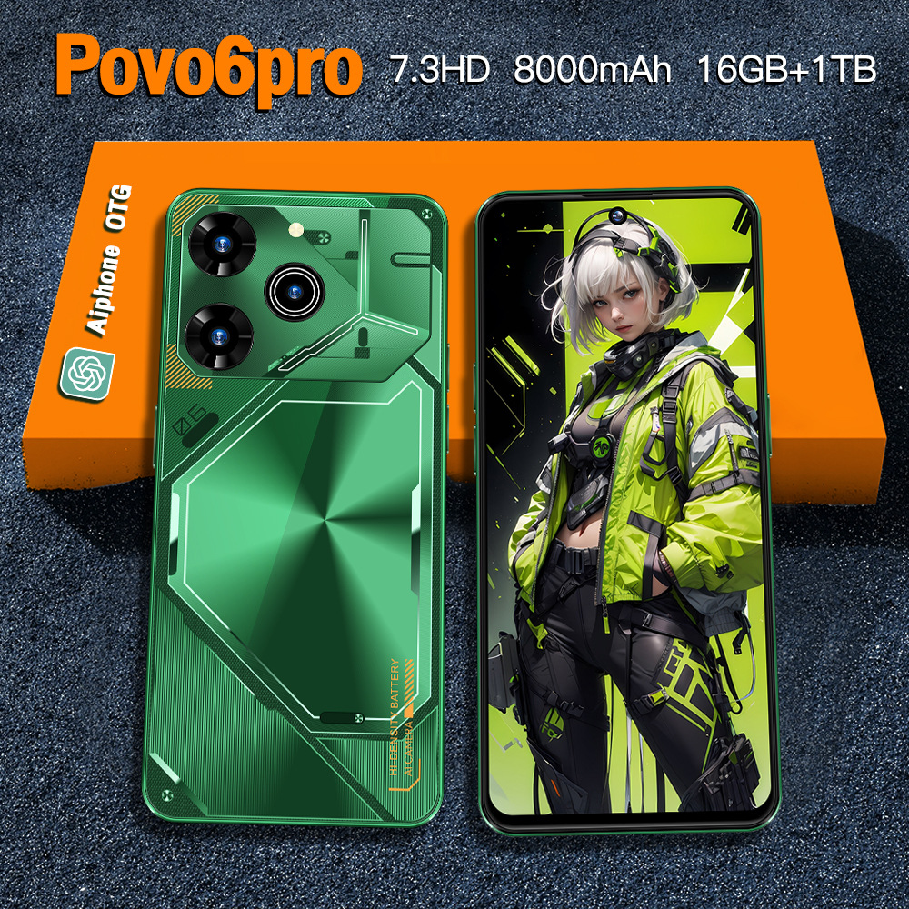 الهاتف المحمول عبر الحدود Povo6 Pro متوفر في المخزون أندرويد 7.3 بوصة HD شاشة التجارة الخارجية 16 1T دفعة الهواتف الذكية