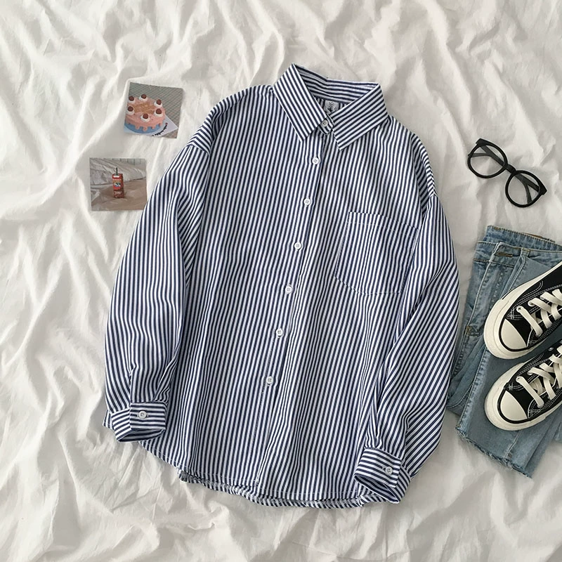 قميص مخطط بأكمام طويلة وطية صدر السترة على الطراز الكوري