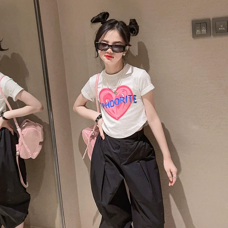 تي شيرت صيفي بناتي بأكمام قصيرة 2024 تي شيرت أبيض جديد للأطفال في الشارع تي شيرت صيفي للفتيات والأطفال الأكبر سنًا ملابس علوية ضيقة