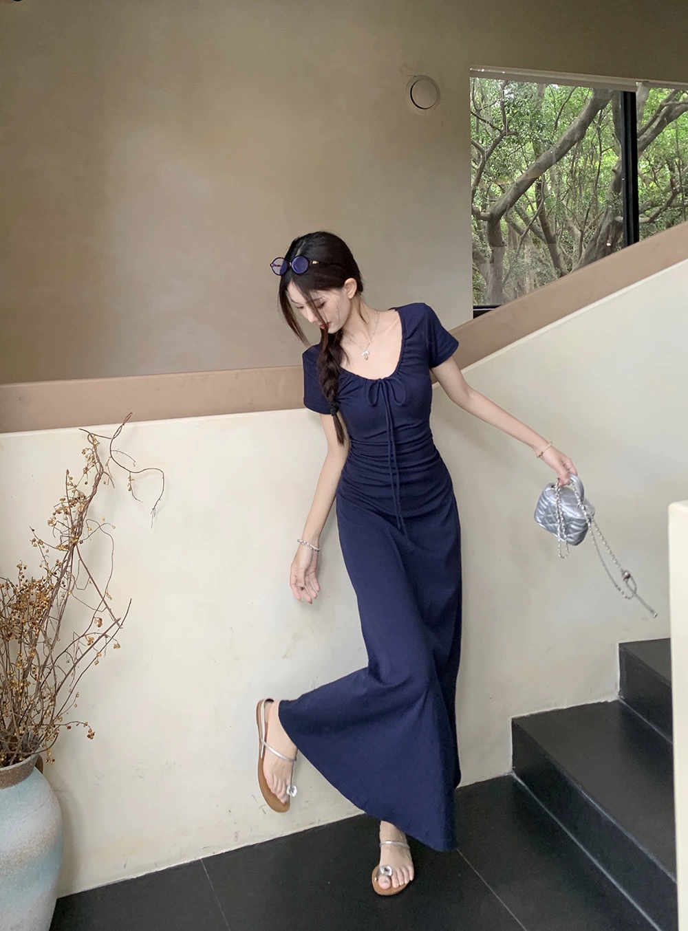 فستان نحيف بأكمام قصيرة مع رباط للتخسيس والمزاج الصيفي