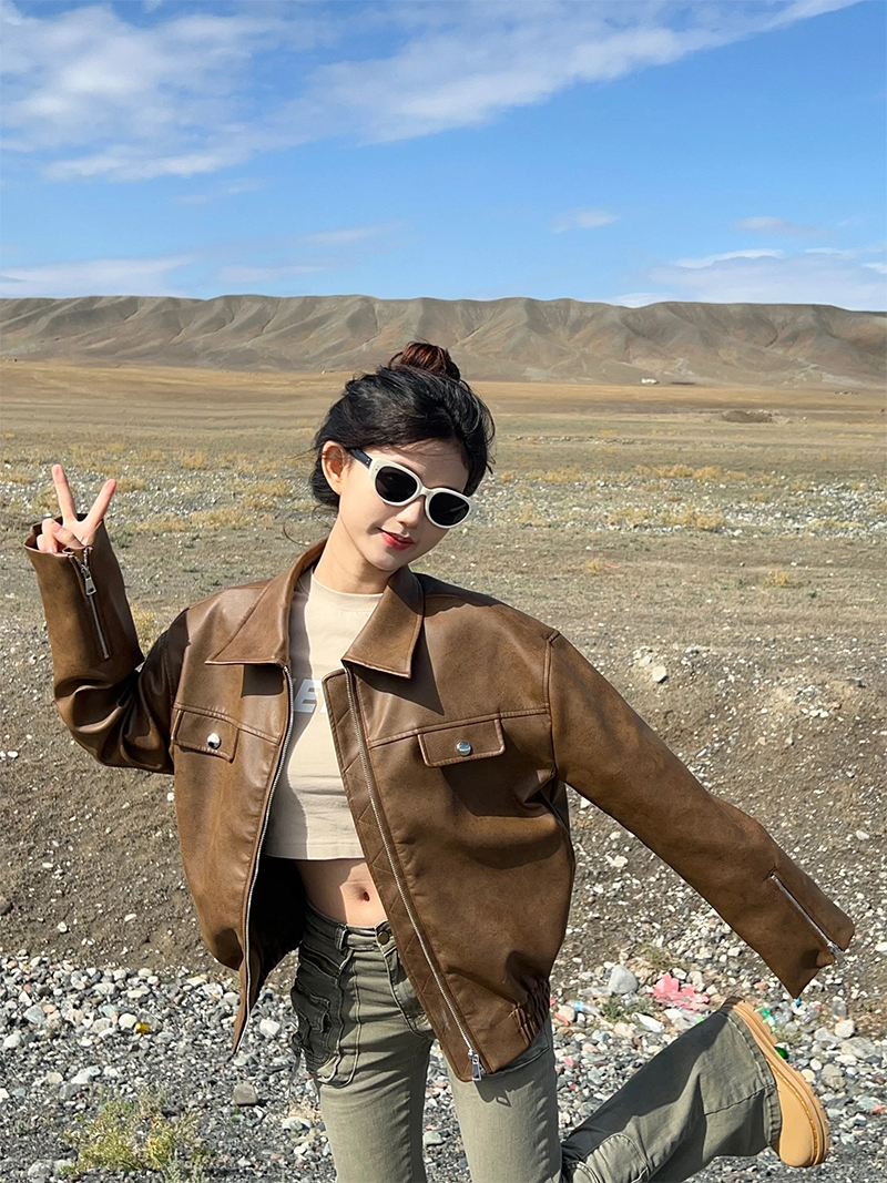 ملابس على طراز Maillard ~ معطف سترة من الجلد البني الشهير الأوروبي الجديد لعام 2023 للنساء لفصلي الخريف والشتاء