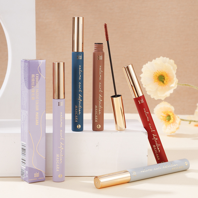 xixi ماسكارا جميلة ملونة رأس فرشاة صغيرة، جذر طويل نحيف، متين مقاوم للماء، مقاوم للعرق، ليس من السهل التطفل