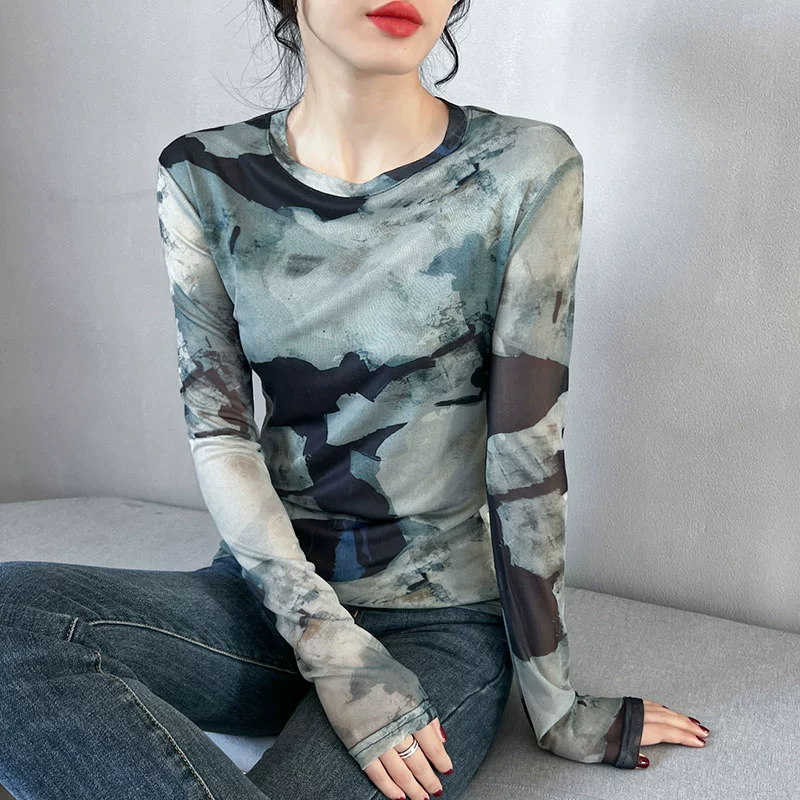 Retro طباعة جديدة غزل صافي الأكمام الطويلة النحيفة