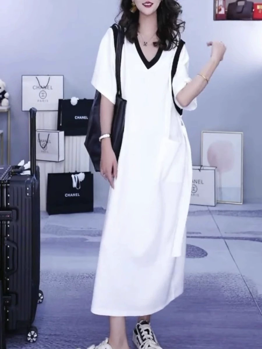 فستان بناتي سمين عالي الجودة بياقة على شكل حرف V ومقاس كبير فستان صيفي جديد بنمط فضفاض وخصر تنحيف تنورة طويلة بيضاء متعددة الاستخدامات