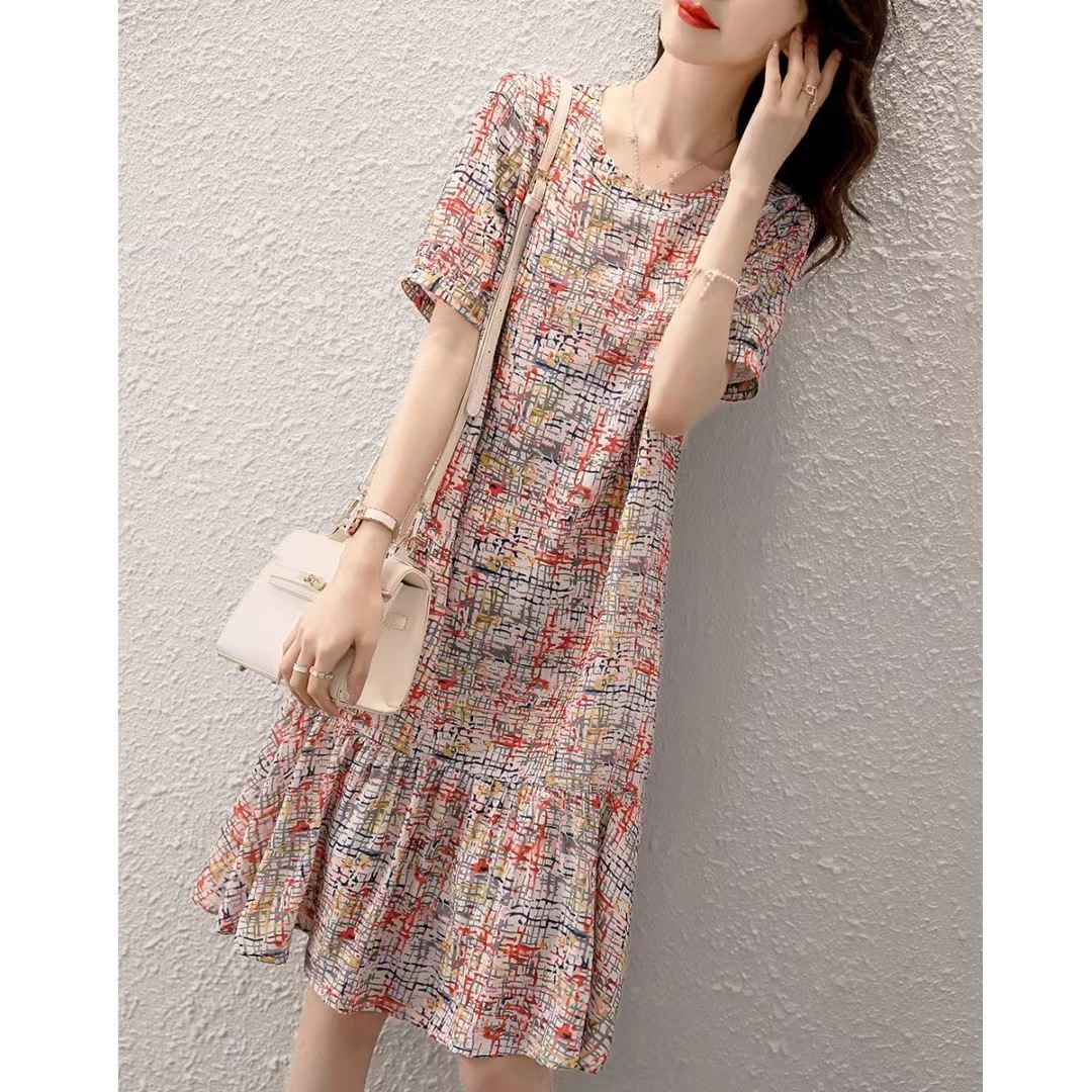 فستان نسائي صيف 2024 نمط جديد صغير أنيق بأكمام قصيرة فستان متوسط الطول على شكل حرف A