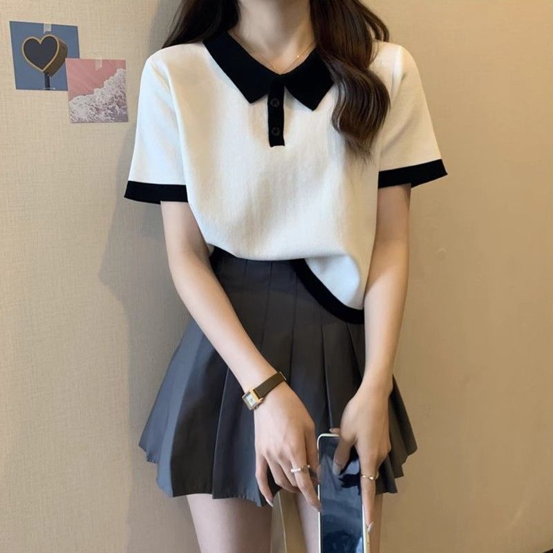 بسيط اللون إدراج طوق قميص أنيق المرأة الصيف فضفاضة سليم صالح شانيل نمط الكورية نمط الرغبة النقية أعلى قصيرة الأكمام
