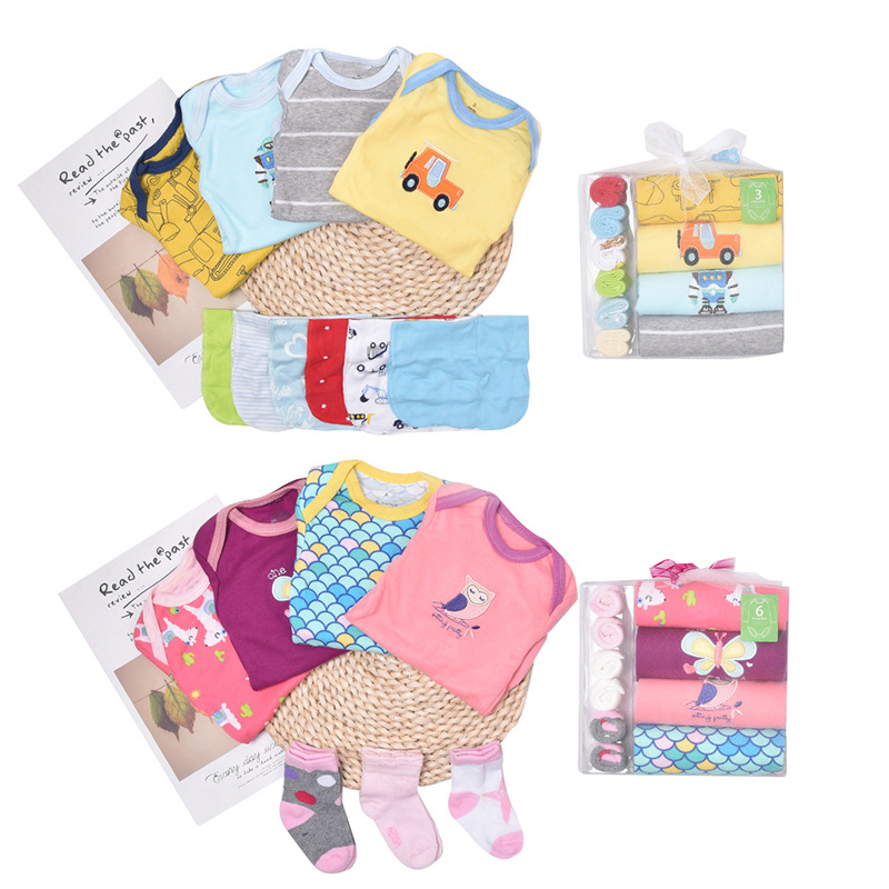 بدلة ملابس أطفال قطنية بأكمام طويلة وملابس منشفة صغيرة وجوارب تناسب الأولاد والبنات صندوق هدايا لحديثي الولادة