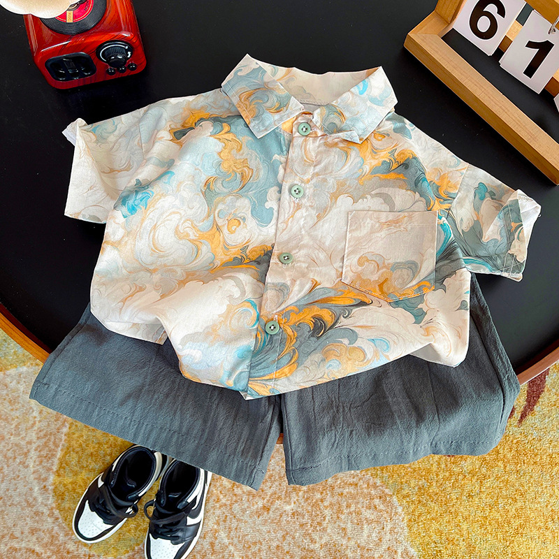 2024 الربيع والصيف الأطفال الجديدة التلبيب قميص معطف الكورية طويلة الأكمام قميص الطفل ملابس الأطفال البدلة قطعتين الموضة