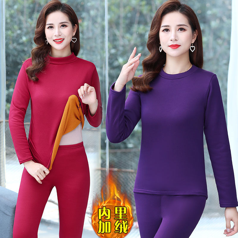 ملابس داخلية حرارية للنساء في منتصف العمر وكبار السن ملابس شتوية للأمهات مبطنة بالصوف ملابس حرارية مكونة من قطعتين ملابس وسراويل نسائية للخريف بياقة نصف عالية