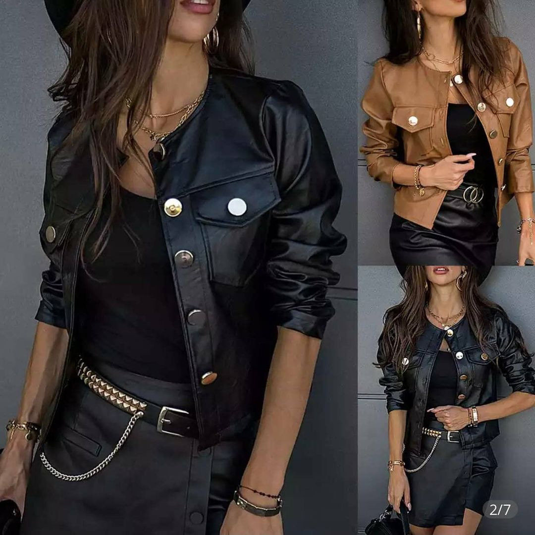 سترة جلدية أنيقة للسيدات أوروبية وأمريكية عبر الحدود لعام 2024 من أمازون برقبة دائرية وصدر واحد من الجلد للنساء