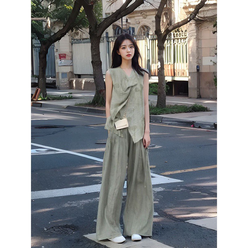 جديد النمط الصيني دعوى المرأة الصيف 2024 جديد النمط الوطني الرجعية سترة دون أكمام أعلى واسعة الساق السراويل الطويلة قطعتين مجموعة