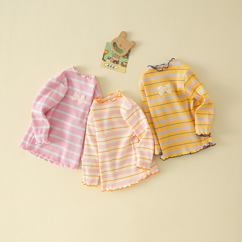 ملابس أطفال مخططة بأكمام طويلة لخريف 2023 قميص قاع للفتيات ملابس أطفال كورية للبيع بالجملة