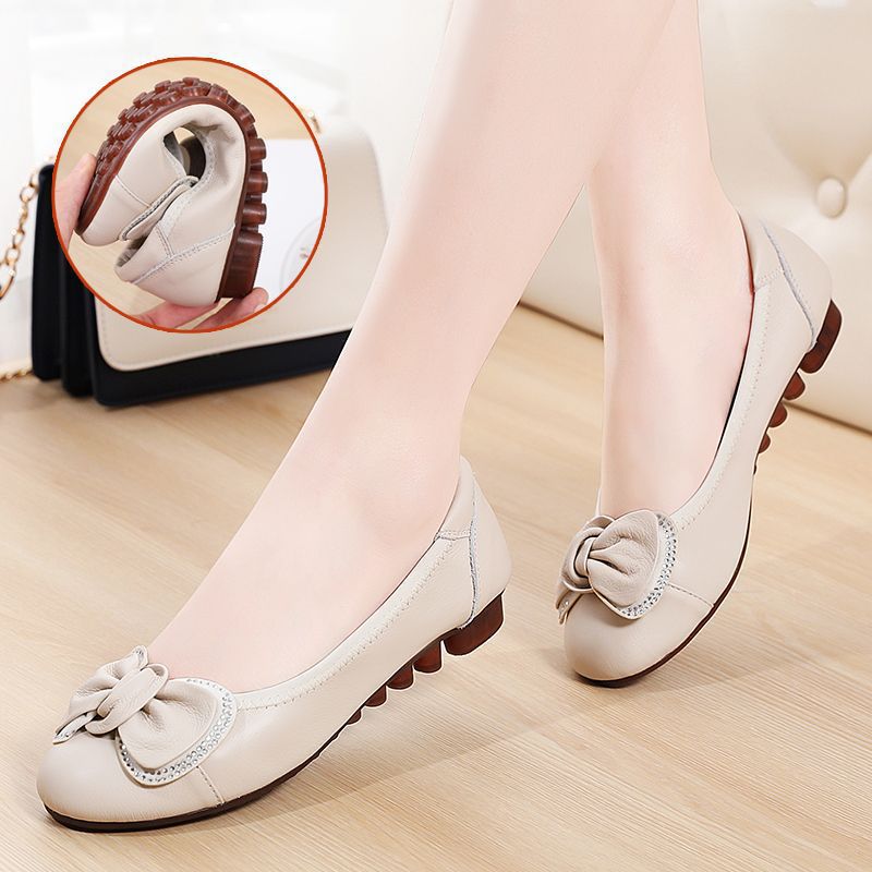 طبقة علوية من جلد البقر أحذية البازلاء النسائية للربيع والخريف مريحة من الجلد الطبيعي ونعل لحم بقري أنيق بفم ضحل وجزء سفلي ناعم ووجه ناعم للنساء الحوامل عبر الحدود