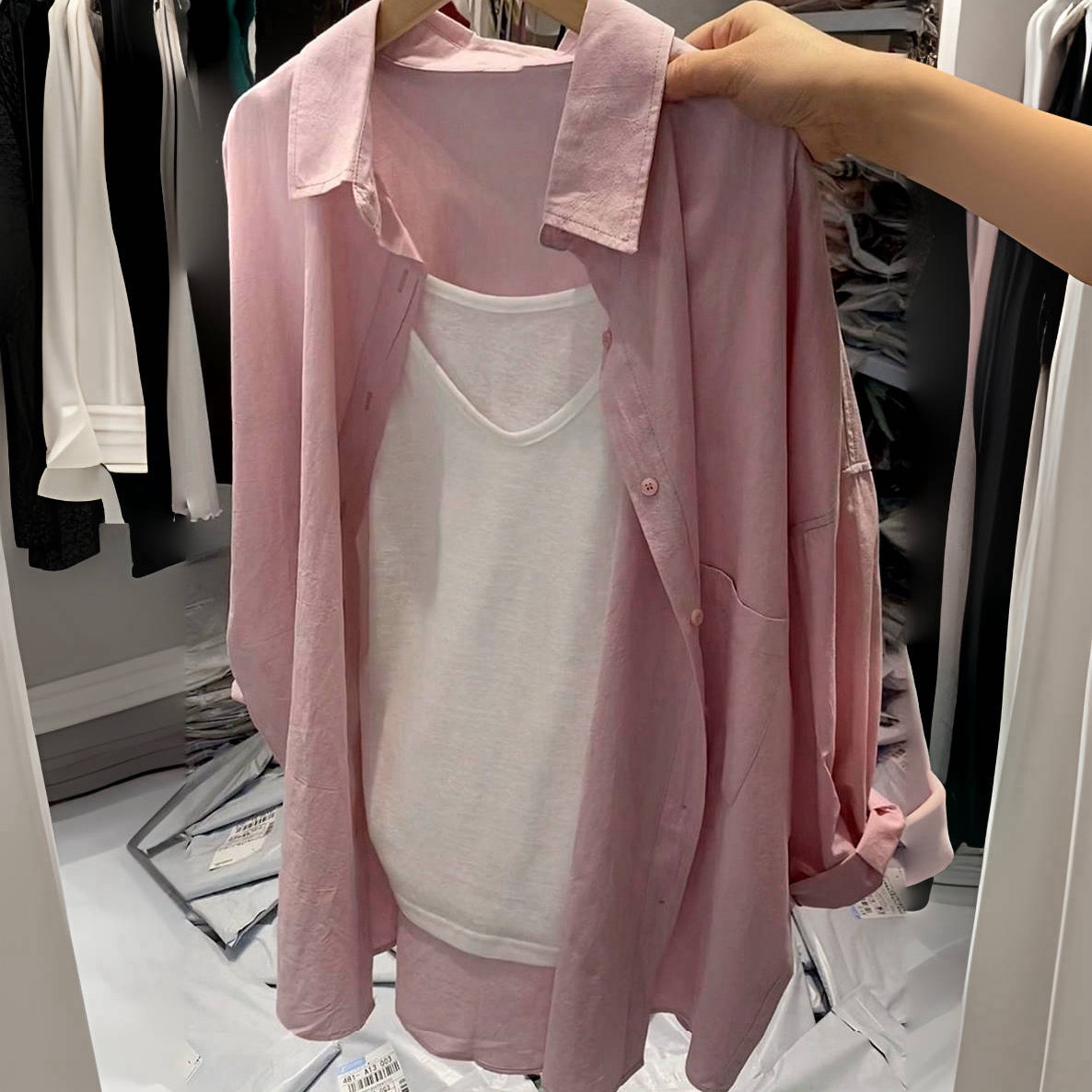قميص قطني فضفاض بأكمام تسع نقاط ومتوسط الطول (قميص فقط) مصنوع من الجلد باللون الأخضر الفاتح
