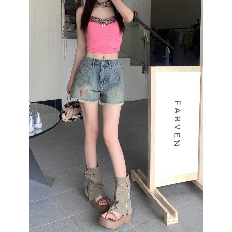 ~ سراويل الدنيم المتعثرة الرجعية الكتابة على الجدران المرأة الصيف عالية الخصر فضفاضة الخام واسعة الساق السراويل الساخنة خط على شكل حرف A