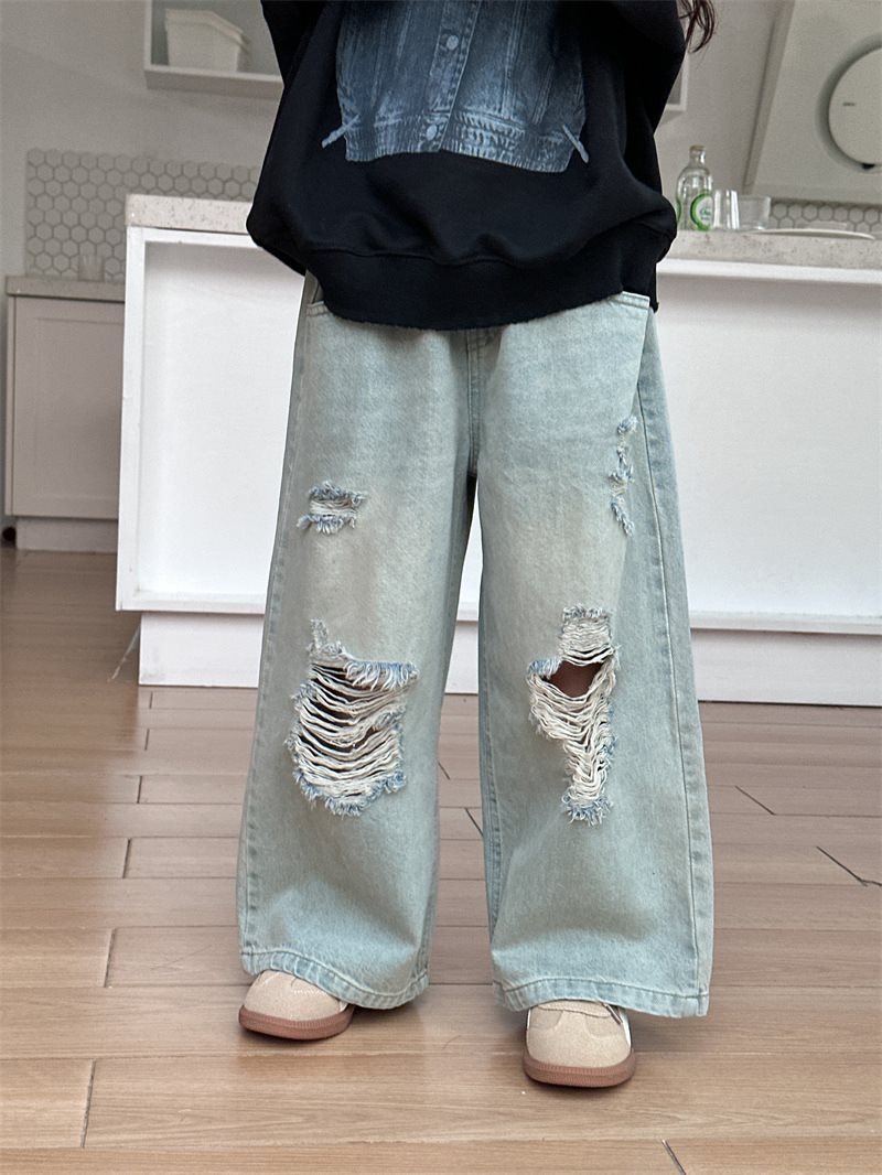 ربيع 2024 ملابس أطفال جديدة للأطفال جينز ممزق كوري للأولاد فضفاض ممزق جينز مستقيم عصري