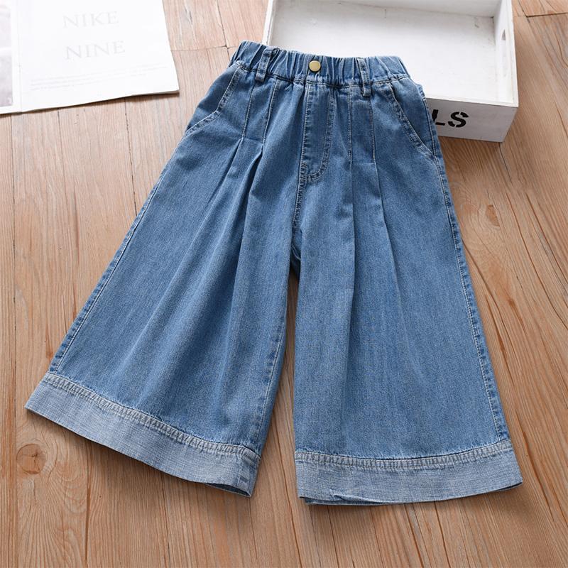 الفتيات الدنيم بنطال ذو قصة أرجل واسعة كابري السراويل صيف 2024 نمط جديد كبير للأطفال رقيقة الفتاة النمط الغربي فضفاض السراويل