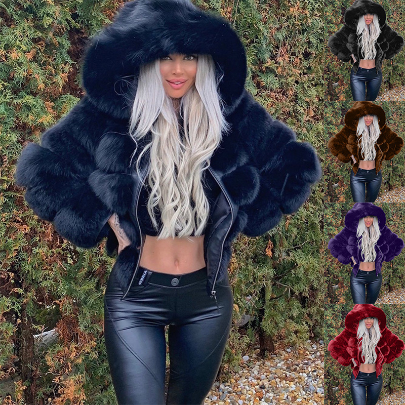 2023 أتمنى معطف فرو تقليد أوروبي وأمريكي بأكمام طويلة بلون سادة وغطاء للرأس للخريف والشتاء معطف دافئ للنساء