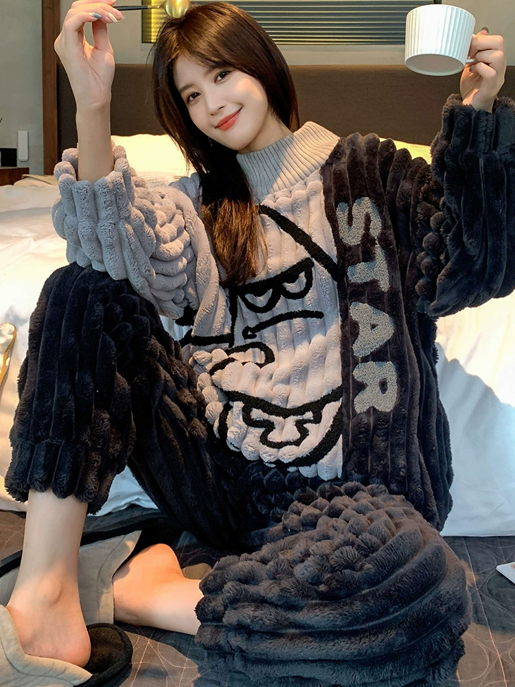 Pajamas Women’s autumn and winter coral velvet plus velvet thickened warm winter cartoon cute flang home clothing set