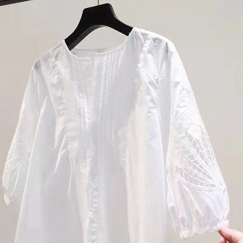قميص علوي فضفاض أصلي متوسط الأكمام تطريز من القطن الخالص