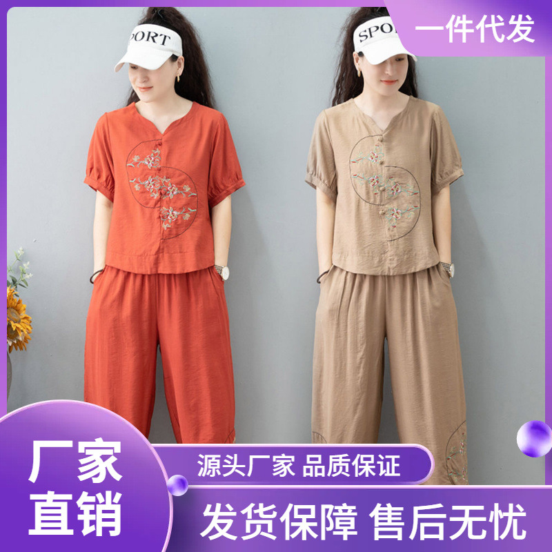 بدلة نسائية صيفية بأكمام قصيرة على الطراز الأجنبي تي شيرت للأم صيفي عصري من القطن والكتان في منتصف العمر من 40 إلى 50 سنة طقم مكون من قطعتين