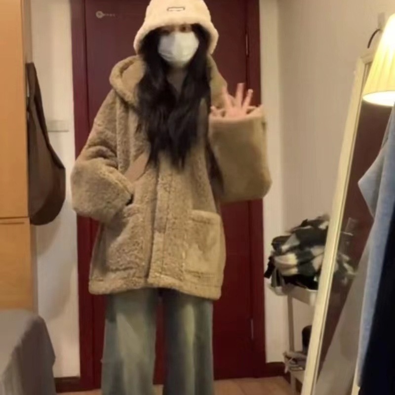 النمط الأمريكي البني سميكة صوف الضأن مقنعين معطف مبطّن بالقطن المرأة شتاء دافئ فضفاض مايوارد الرجعية سترة معطف الموضة