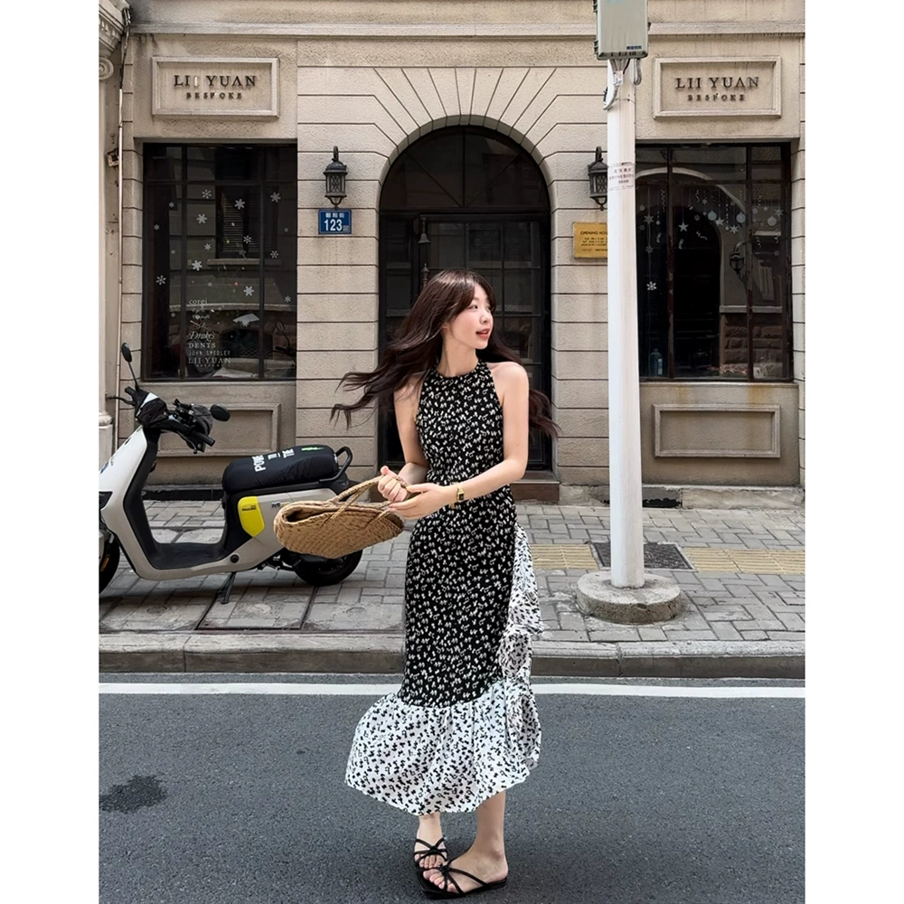 فستان فرنسي بألوان متباينة بتصميم كلاسيكي صيفي جديد برقبة رسن