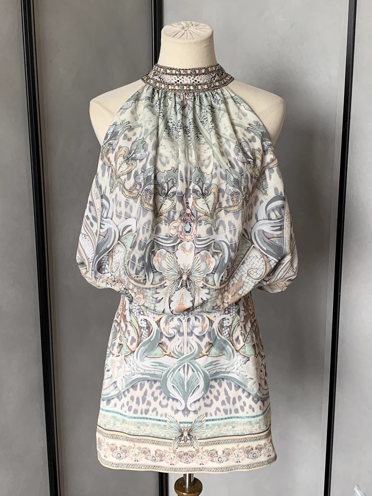 [أنيق وأنيق] فستان يعانق الخصر ويعانق الورك مع خط عنق مطبوع بالألماس، ورقبة رسن، وتنورة قصيرة تنحيف