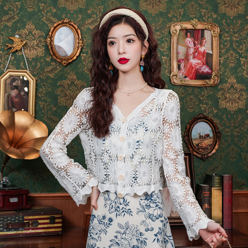سترة متماسكة مجوفة تصميم سترة قصيرة للربيع والصيف للحماية من الشمس، تنورة متطابقة، معطف صغير، كم طويل، ملابس خارجية أنيقة