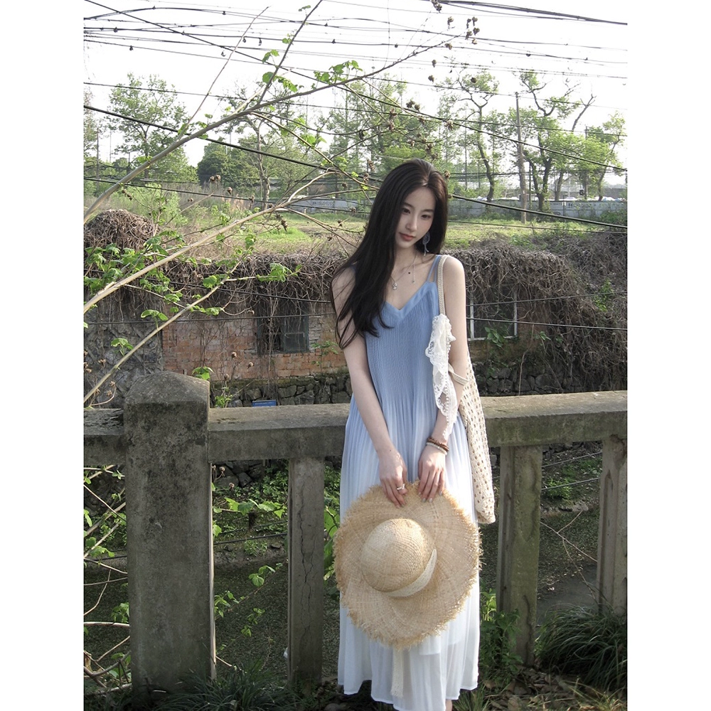 التدرج اللون الصيف شاطئ البحر تنورة طويلة فضفاضة الحمالة الخامس الرقبة