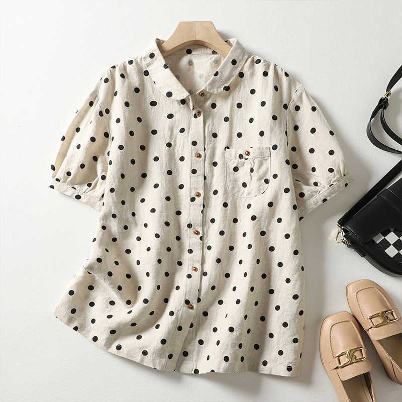 لقطة حقيقية في المخزون من القطن والكتان لتخفيض العمر، قميص فرنسي بنقاط مموجة، قميص صيفي نسائي