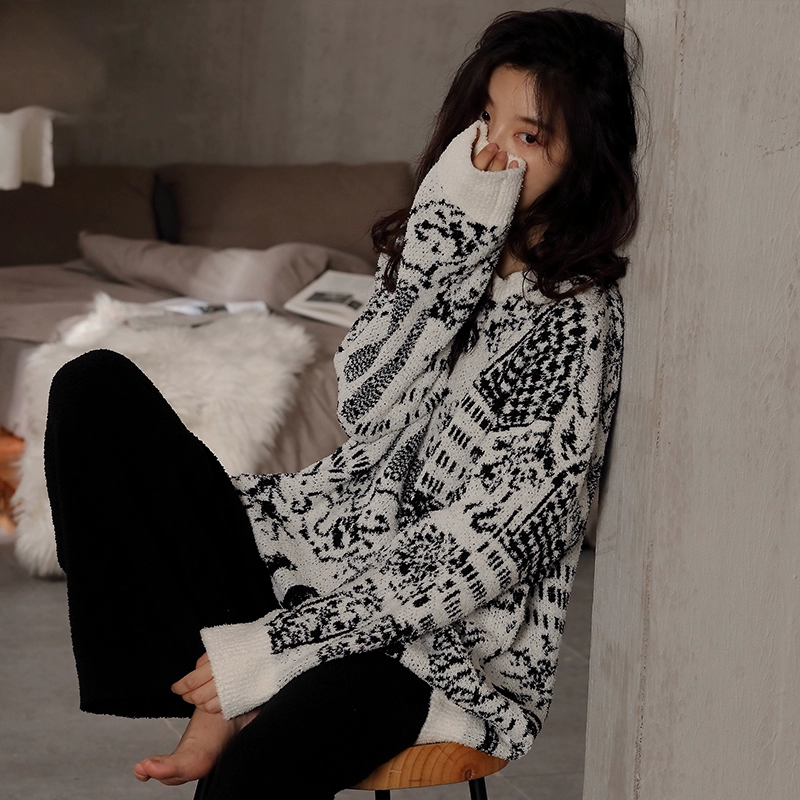 بيجامة للنساء بلوفر شتوي مخملي مرجاني مطبوع 2024 جديد من الفلانيل المخملي السميك يمكن ارتداؤه خارج المنزل