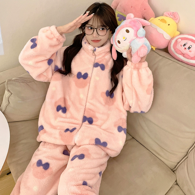 بيجامة الخريف والشتاء للسيدات من المخمل المرجاني بسحاب مخملي سميك 2024 خدمة منزلية جديدة للفتيات الكرتونية فلانج