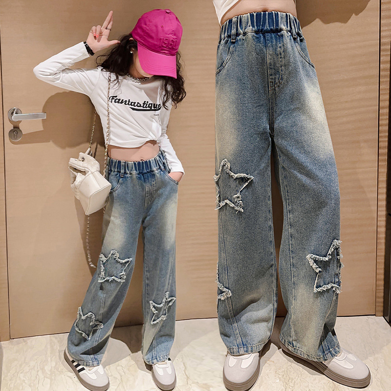 سراويل الفتيات لباس خارجي للربيع والخريف 2024 نمط جديد جينز ربيعي للأطفال متوسط وكبير فضفاض مستقيم وواسع الساق للفتيات