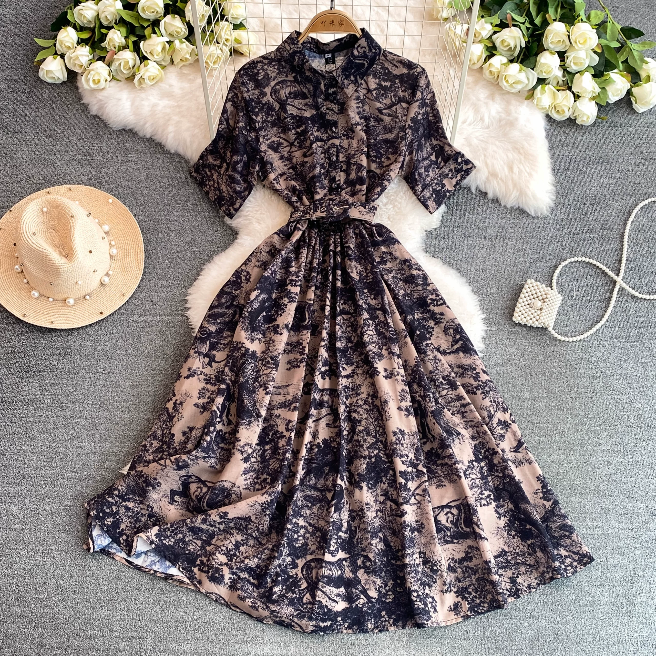 فستان أنيق بأكمام طويلة مع طباعة رسم بالحبر